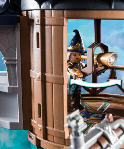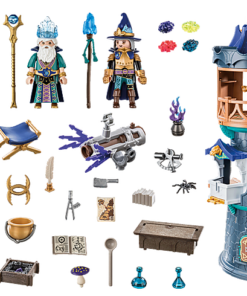¡Explora el fantástico mundo del poderoso mago Timithor, el Guardián del Tiempo! En la legendaria Torre del Mago de Violet Vale está el taller de magia de Sagithor, amigo y compañero de Timithor. Allí es donde se practican los hechizos y se elaboran las pociones mágicas. La mística torre guarda muchos secretos, incluso un valioso tesero está escondido aquí. Sin embargo, capturar los cristales brillantes es casi imposible, porque la puerta de la planta baja está bloqueada por una cerradura mágica que solo se puede abrir por magos reales. Desde la torre, la hechicera Crysthella vigila el peligro a través de sus prismáticos. Si los demonios o los magos oscuros se acercan a la torre, serán recibidos con proyectiles. El set de juego incluye a los magos de Novelmore Sagithor y Jutsithor y la hechicera Crysthella, un mago de la torre con un mecanismo giratorio y escondite secreto, así como un cañón de disparo, un caldero mágico, un libro de hechizos, cristales y muchos más extras por un juego mágico.