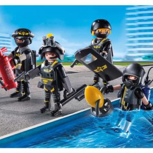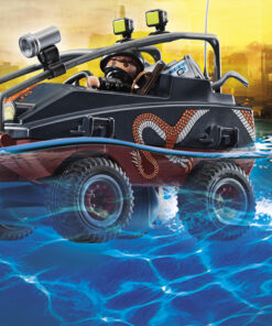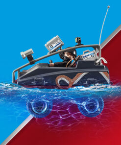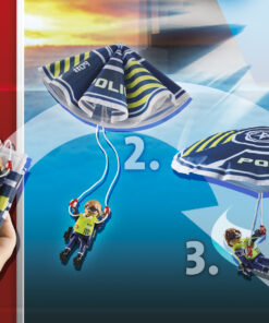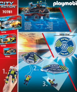 Un ladrón se da a la fuga con su vehículo anfibio. Guardó la maleta de dinero de forma segura detrás del asiento del conductor. Para esconderse, se adentra en el bosque. Pero la policía de PLAYMOBIL también tiene una solución para este caso. Desde el aire, localiza el vehículo y un paracaidista cae directamente sobre el lugar. El ladrón no esperaba eso y no puede huir a tiempo. Este paseo termina en prisión. El set de juego contiene dos figuras de PLAYMOBIL, un vehículo anfibio, un paracaídas, esposas, una caja de dinero, una palanca y otros extras. El vehículo puede flotar y se puede actualizar con un motor submarino. Cuando el paracaídas se enrolla y se lanza al aire, la figura de PLAYMOBIL adjunta flota suavemente hacia el suelo.