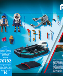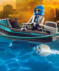Alarm in der Stadt! Jemand ist in das Museum eingebrochen. Jetzt flieht der Verdächtige in einem Schlauchboot. Seine Diebesbeute hat er in einem Schlafsack versteckt. Obwohl der Räuber mit seinem Boot schnell unterwegs ist, ist ihm ein cleverer PLAYMOBIL-Polizist mit seinem Jetpack schon auf den Fersen. Geschwind nähert sich der Beamte dem Boot aus der Luft und springt mit einem Satz an Bord. Ein paar Minuten später klicken auch schon die Handschellen. Zum Glück sind die wertvollen Kunstgegenstände unversehrt und können an das Museum zurückgegeben werden. Das Spielset enthält zwei PLAYMOBIL-Figuren, ein Schlauchboot mit Außenbordmotor, ein Jetpack, einen Schlafsack, Kunstgegenstände und viele weitere Extras. Das Boot kann schwimmen und mit einem Unterwassermotor aufgerüstet werden.