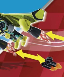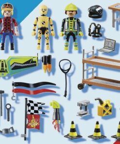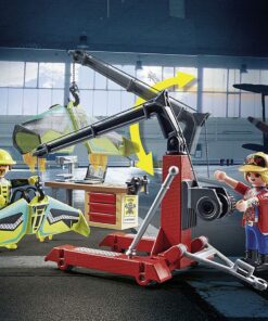 «En la Estación de Servicio de Acrobacias Aéreas, los aviones son revisados para poder volar. Un piloto acaba de entrar en el taller con su traje de alas defectuoso. La mecánica levanta cuidadosamente el avión con la grúa para poder examinarlo por todos los lados. Las boquillas de propulsión están rotas y deben ser sustituidas. Afortunadamente, la estación de servicio está bien equipada. Después de un rato, el piloto puede ponerse de nuevo el traje de alas y probarlo. El set incluye dos figuras PLAYMOBIL, un traje de alas, un banco de trabajo, una grúa móvil con polipasto, una caja de herramientas y muchos otros extras para reparar diversas máquinas voladoras.»