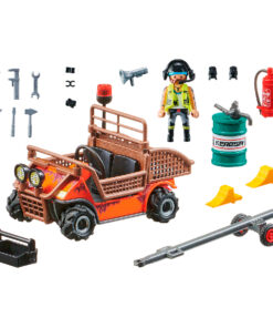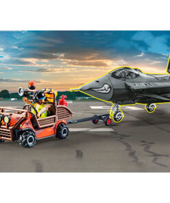 «Si una aeronave necesita ser reparada, el servicio de reparación móvil acude inmediatamente al lugar. El conductor maniobra hábilmente su camión de servicio hasta el avión y se engancha a la rueda de cola con la barra de empuje. Una vez que todo está bien sujeto, se aleja lentamente y remolca la aeronave hasta la estación de servicio. Para las reparaciones menores, el mecánico ha guardado las herramientas y el barril de combustible en la plataforma del camión. El set incluye una figura PLAYMOBIL, un vehículo de reparación, una barra de empuje, un barril de gasolina, un extintor y otros extras. El servicio de reparación puede combinarse idealmente con los sets 70831 Air Stuntshow Biplano Phoenix y 70832 Air Stuntshow Avión Eagle».