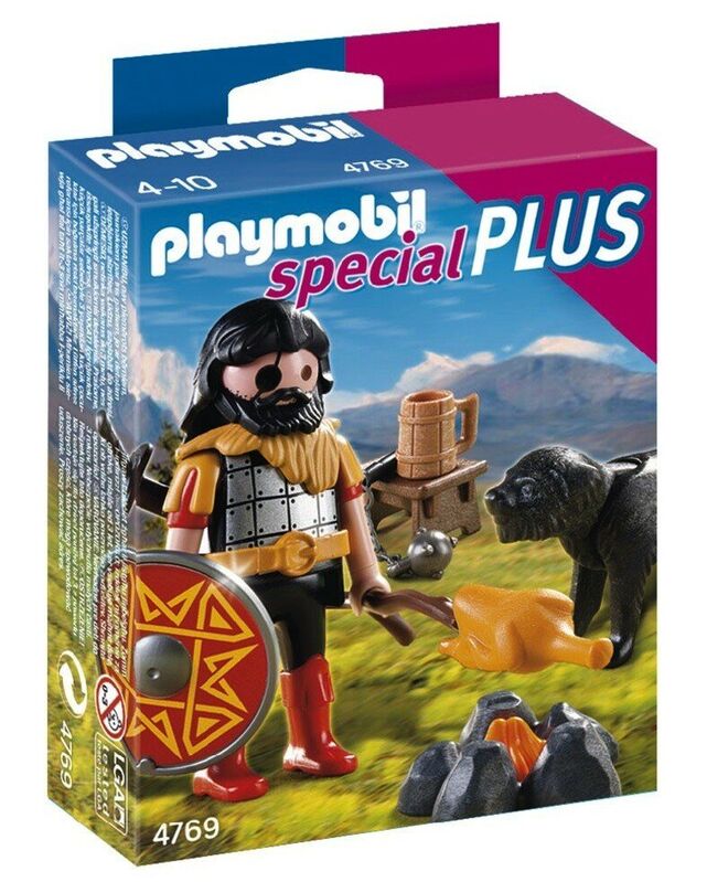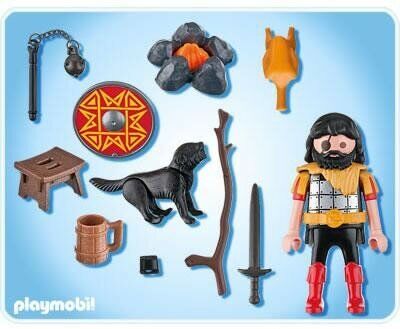 Figura de Caballero Bárbaro con escudo, espada, cinturón, piel para el cuello, rama con pollo, fogata, banqueta, jarra para beber, perro y mangual.
