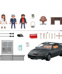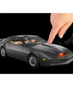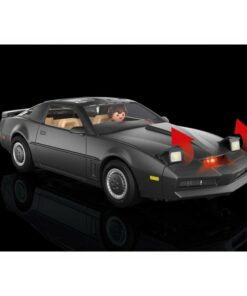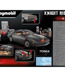 El coche fantástico es una trepidante aventura de un hombre que no existe, en un mundo lleno de peligros. Michael Knight, un joven solitario embarcado en una cruzada para salvar la causa de los inocentes, los indefensos, los débiles, dentro de un mundo de criminales que operan al margen de la ley». Un detective que se creía muerto, ahora con una nueva identidad. Le mueve la justicia y se propone acabar con el crimen con la ayuda de K.I.T.T., un coche futurista con inteligencia artificial y equipado con artilugios y armas de alta tecnología. Ahora K.I.T.T., el legendario coche de la serie de éxito de los 80 Knight Rider, llega a la flota de coches PLAYMOBIL. Al igual que su hermano mayor, PLAYMOBIL K.I.T.T. está equipado con toda una serie de funciones auténticas, como una simulación de impresora debajo del salpicadero para imprimir fotos de la ficha policial, una matrícula giratoria, una cuerda con gancho de agarre, faros emergentes y un techo desmontable. K.I.T.T. cuenta con sonidos y luces electrónicas que se accionan mediante una función táctil en el capó. El vehículo cita frases de la serie con la icónica voz original de K.I.T.T. Las citas específicas están asociadas a la función de encendido/apagado y las demás se reproducen de forma aleatoria. Al mismo tiempo, la icónica luz del escáner de la parte delantera del vehículo se enciende y la luz del salpicadero parpadea. Además del personaje, Michael Knight, el set de juego también incluye accesorios muy detallados, como el laboratorio informático de Bonnie Barstow y los muebles de la oficina de Devon Miles. Ahora es el momento de subir al coche y conducir hacia la siguiente misión.