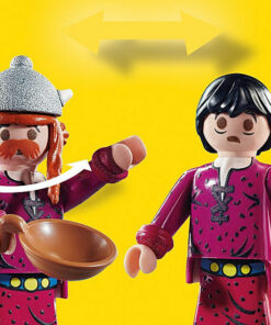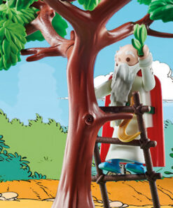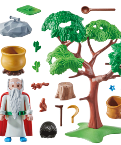 Panorámix es el venerable druida de la aldea, corta muérdago y elabora pociones mágicas. Su especialidad es la poción mágica que da, a quien la bebe, una fuerza sobrehumana. Pero Panorámix también tiene otras recetas en la manga. Para sus mezclas, el druida echa hierbas e ingredientes en el gran caldero mágico. Hoy, el anciano del pueblo, Edadepiedrix le ayuda. El espía romano Caligula Minus, que en la aldea se llama Caligulaminix se le permite probar la primera cucharada de la poción mágica recién elaborada. La poción funciona, Caligulaminix puede levantar inmediatamente una gran piedra sin esfuerzo con un solo brazo. Pero, ¿qué ocurrirá cuando se pase el efecto y los galos descubran al espía? El set de PLAYMOBIL contiene al druida Panorámix, al galo Edadepiedrix y al espía romano Caligula Minus con cara y peluca cambiables para desenmascararlo, varias hierbas, hojas y flores para elaborar pociones mágicas, un caldero, un árbol, una gran piedra para levantar y muchos otros extras para una emocionante diversión gala.