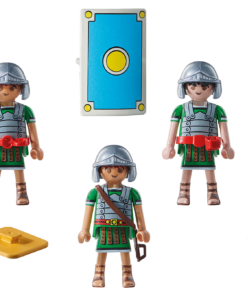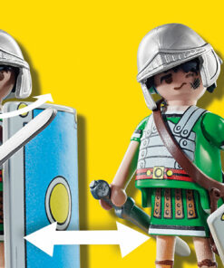 Es el año 50 AC. Desde hace muchos meses, los legionarios romanos posicionados, como guarnición, en los campamentos fortificados de Babaourum, Aquarium, Laudanum y Petibonum intentan capturar un pequeño pueblo de irreductibles galos que no deja de resistirse al invasor. Para derrotar definitivamente a los galos, los romanos atacan con su famosa formación de tortuga. En esta formación de ataque especial, los soldados se abren camino protegidos por escudos al frente y arriba. Pero una vez más, Astérix, Obélix y los aldeanos no tienen intención de rendirse. Un sorbo rápido de poción mágica y se lanzan a la batalla. La vida no es fácil para los legionarios romanos que tienen que enfrentarse a estos galos. El set de PLAYMOBIL se compone de cuatro romanos con cascos, espadas y escudos. Se incluye una placa de soporte para cada figura para mayor estabilidad. Todas las figuras tienen una cara alterna que muestra las caras antes y después de la batalla.