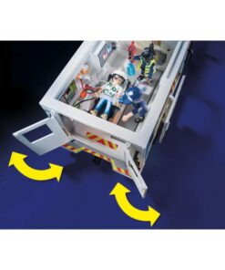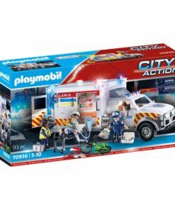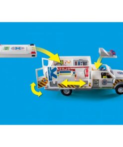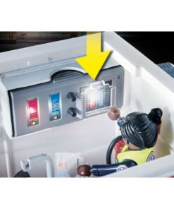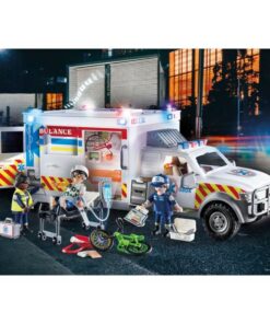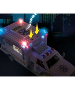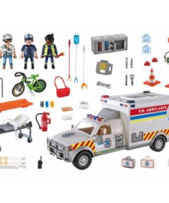 El set contiene una ambulancia, un médico y dos paramédicos, un hombre, una bicicleta, una camilla de ambulancia, un maletín médico, una placa de diagnóstico y muchos otros extras para emocionantes operaciones de rescate. Se pueden activar varios efectos de iluminación a través de dos botones. Los techos de la cabina del conductor y del carro de tratamiento son desmontables. El maletín y el equipo del médico se pueden guardar en el cajón debajo de la cabina del conductor.