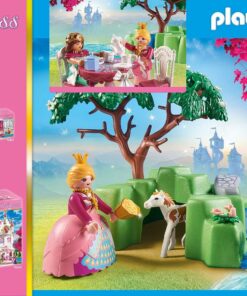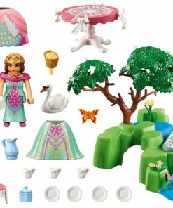 - El set incluye dos figuras PLAYMOBIL, un estanque con puente, un potro, un cisne, dos sillas, una mesa y muchos otros encantadores extras para un juego de rol imaginativo en la habitación de niños y niñas. Las faldas, la corona y el adorno del pelo son desmontables. Las figuras pueden, sin faldas, sentarse en las sillas y llevar taza y jarra en la mano. Se puede jugar con el Promo Pack Princesas solo o combinado con otros playsets de PLAYMOBIL
