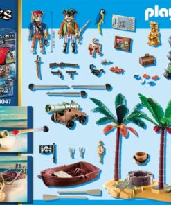 - El Promo Pack incluye una figura de pirata PLAYMOBIL, un esqueleto, una bandera con calavera, un loro, un mono bebé, un bote con remos, un cofre con monedas, sombrero de pirata, mapa del tesoro y otros extras para emocionantes juegos de rol de piratas en la habitación de niñas y niños. El cofre del tesoro puede ocultarse y cubrirse con la cortina giratoria de hojas. El funcional cañón es móvil y se carga desde la parte delantera. El set incluye tres proyectiles. Juega con este Pack Promocional solo o con amigos y amigas o combínalo con otros sets de PLAYMOBIL.