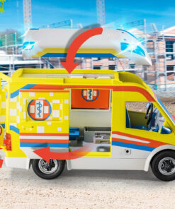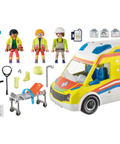 Contenido: Figuras: 1 paramédica, 1 paramédico masculino, 1 herido; Accesorios: 1 ambulancia con módulo de luz y sonido, 1 camilla de transporte de pacientes, 1 bolsa de suero,1 desfibrilador, 1 carpeta de documentación, 3 tablas de diagnóstico, 3 vendajesa, 1 casco de construcción, 1 martillo neumático, 1 vendaje para la cabeza, 2 vendajes de yeso, material de vendaje, 1 reloj de pulsera, 1 estetoscopio