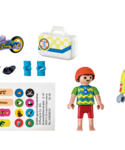 El cuidadoso paramédico siempre está dispuesto a ayudar. Para el tratamiento inicial de las heridas, tiene su botiquín con férulas y muchas vendas. Trata cuidadosamente la herida del niño herido y le aplica una férula en la pierna. El divertido esparadrapo de dinosaurio hace que el pequeño paciente vuelva a sonreír en poco tiempo. Un gran recuerdo o regalo para los pequeños paramédicos. El set de juguete a partir de 4 años incluye dos figuras PLAYMOBIL, un patinete, un botiquín, férulas de vendaje, un casco y otros extras. Con las escayolas incluidas se pueden curar las heridas. Las «heridas» en el brazo y la pierna de la figura del niño están hechas de pintura sensible al calor, que desaparecen al frotar y vuelven a ser visibles después de enfriarse. La máscara bucal, el casco y las zapatillas de baño son desmontables. La serie PLAYMOBIL City Life incluye modernos vehículos y personajes realistas con los que los niños pueden desarrollar importantes habilidades y sumergirse en emocionantes juegos de rol.
