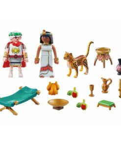 Inspirándose en la película «Cleopatra» de 1963, René Goscinny y Albert Uderzo crearon uno de los personajes más famosos del universo Astérix: La reina Cleopatra. Colérica, autoritaria, leal, de gran corazón e increíblemente bella, Cleopatra es una mujer impresionante que no sólo inspira admiración a Panorámix. En el diálogo con César saltan chispas entre estas dos deslumbrantes figuras de la historia y se rompe algún que otro jarrón. Tampoco puede faltar en este escenario el famoso leopardo. Con el set César y Cleopatra de PLAYMOBIL, los fans de los irreductibles galos ya pueden recrear en casa las escenas más famosas del cómic o inventar sus propias historias.