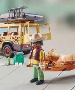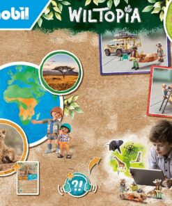 Set de juego sostenible de WILTOPIA de PLAYMOBIL con el veterinario Dr. Jamie Palmer, un vehículo todoterreno propulsado por energía solar, así como un león herido y numerosos extras.