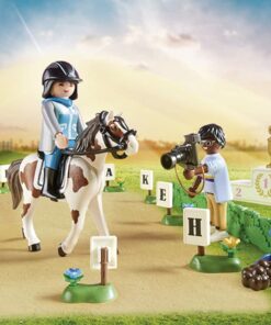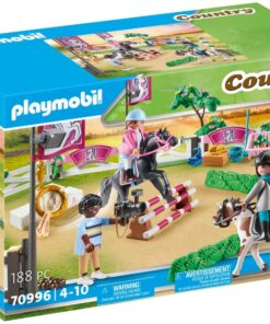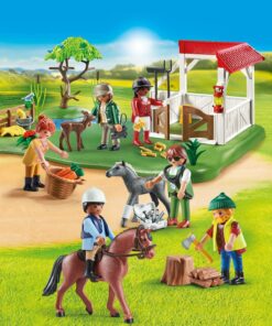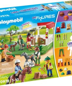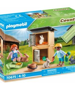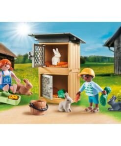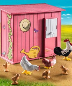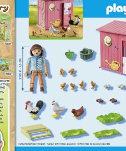 Contenido: Figura: 1 mujer; Animales: 2 gallinas, 1 gallo, 6 pollitos; Accesorios: 4 huevos, 2 suelos de hierba, 1 gallinero