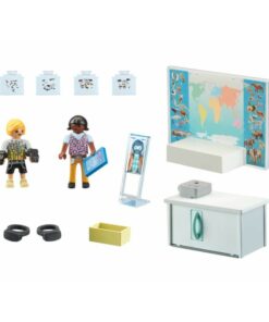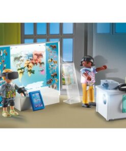 Esta Aula Virtual lo tiene todo. Aquí, los alumnos y alumnas pueden sumergirse en mundos de aprendizaje digital. Con el proyector en funcionamiento, se pueden proyectar grandes imágenes en la pantalla en un instante. Las gafas de RV abren experiencias de aprendizaje completamente nuevas para los alumnos/as, y con la moderna tablet, investigar en Internet es el doble de divertido. El aula virtual es el juego ideal para niños/as curiosos a los que les encanta inventar sus propias historias. El set de juguete viene con dos figuras PLAYMOBIL, un proyector, una pantalla, una tableta, dos pares de gafas VR y otros modernos extras para juegos de rol creativos.
