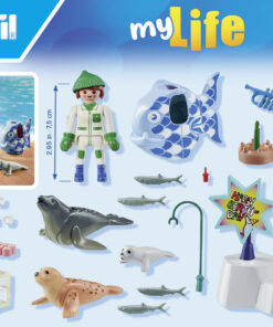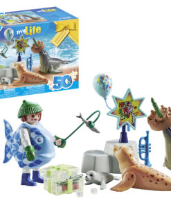 Creatividad, diversión y alegría con el Set de Regalo PLAYMOBIL Cuidador con animales. Este set viene ya empaquetado en una caja decorativa que incluso tiene espacio para el nombre del cumpleañero. Despídete de las molestias del envoltorio. Sumérgete en el mundo de los cumpleaños con las adorables focas, donde celebran su cumpleaños y su cuidadora va vestida de pez, equipada con una trompeta para hacer una gran entrada. Con una caña de pescar, da de comer a las focas un festín de pescado guardado en una nevera con cubitos de hielo, un salmón gigante. Pero eso no es todo. La estrella del espectáculo es el impresionante león marino, que, con la ayuda de un adaptador especial, puede equilibrar una tarta de cumpleaños sobre su nariz. Tanto el león marino como la foca tienen cabezas y aletas móviles.