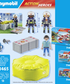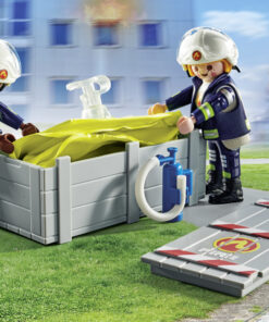 ¡El nuevo set PLAYMOBIL «Bomberos con colchoneta» convierte el rescate en una aventura! Dos valientes bomberos han colocado una colchoneta inflable de rescate para rescatar de las llamas de forma segura a una persona. La colchoneta se infla y desinfla sin esfuerzo, y el práctico tapón retiene el aire de forma segura. Después de la misión, el aire puede soltarse, y la colchoneta puede guardarse de forma compacta en la caja de dos piezas. Los detallados cascos de bombero de las figuras son desmontables, lo que permite un juego de rol realista. Un auténtico set de juego para vivir emocionantes aventuras que no sólo fomenta la creatividad, sino que también mejora las habilidades sociales y la comprensión de la seguridad: ¡un regalo ideal para niños y niñas a partir de 4 años!