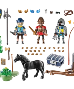 - El mundo de juego de los caballeros de Novelmore de PLAYMOBIL está lleno de sorpresas. Los caballeros de Novelmore trasladan en su convoy no solo tienen planos secretos, sino también oro de dragón cargado. Los bandidos de Burnham quieren conseguir esa valiosa carga y derriban un árbol para detener al convoy de transporte. Sin embargo, los caballeros de Novelmore harán todo lo posible para defender su propiedad. Con grandes héroes, astutos villanos, criaturas misteriosas e ingeniosas armas, Novelmore ofrece una diversión inmensa para niñas y niños creativos a partir de 4 años. El set de juego incluye tres figuras de PLAYMOBIL, un caballo, una placa base con un árbol inclinado, un arco y flechas, oro, una ballesta y muchos otros extras fantásticos para emocionantes juegos de roles en la habitación de los más pequeños.