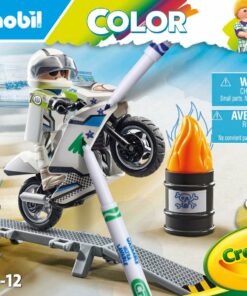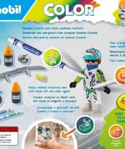 Diversión máxima para los aficionados a los deportes con el Skater con baloncesto de PLAYMOBIL Color. El jugador de baloncesto practica en el aro para mejorar su precisión de tiro. Simplemente coloca la figura en la plataforma de salto, ¡y empieza la acción! Con el innovador mecanismo, la pelota puede lanzarse en diferentes ángulos, dependiendo de la posición del brazo lanzador y del funcionamiento del muelle. Para aumentar la precisión, el aro transparente se coloca sobre el aro. La etiqueta con revestimiento especial permite crear coloridos diseños con los rotuladores incluidos. La esponja incluida permite pequeñas correcciones en el diseño.