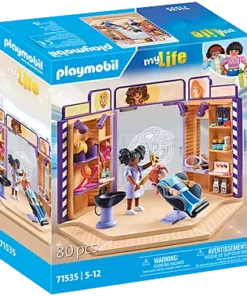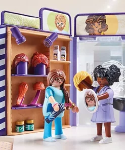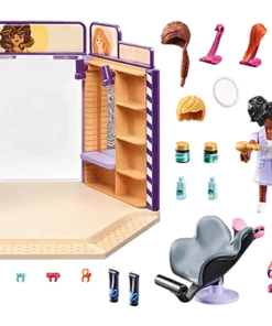 Contenido: Figuras: 2 mujeres; Accesorios: 1 placa base de 6 esquinas, 1 pared lateral transparente, 2 paredes laterales con estante insertado, 3 soportes de techo, 1 carro de peluquería, 1 silla de peluquería con reposacabezas, 1 lavabo de peluquería, 1 bote de spray, 1 tijeras, 1 secador, 1 peine, 1 cepillo de pelo, 1 espejo redondo, 8 lazos para el pelo, 4 flores para el pelo, 3 bustos de grandes almacenes con cabezas intercambiables, 2 bote de cosméticos, 1 caja de pinturas, 2 tubo, 2 vasos con tapas, 2 zumos, 1 cortador de pelo largo, 1 lámina de espejo.