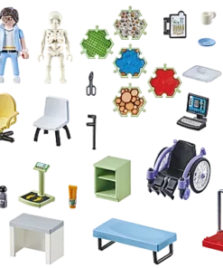 El set de juguete de 69 piezas incluye muchos accesorios del mundo de la ortopedia: cama de tratamiento, báscula, varios andadores, herramientas, así como dos figuras PLAYMOBIL, una silla de ruedas y muchos otros accesorios médicos. La prótesis de tres partes se puede poner y quitar de la figura femenina.