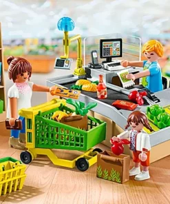 Contenido: Figuras: 1 mujer, 1 hombre, 1 niña; Accesorios: 1 lector de tarjetas, 1 carro de la compra, 1 cesta de la compra.