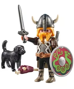 ¡Aventuras épicas con el vikingo de PLAYMOBIL y su leal perro guardián! Con una espada, un escudo y una temible hacha de dos cabezas que puede sujetarse firmemente a su capa, este valiente guerrero está preparado para todo. Su fiel perro guardián está siempre a su lado, con mandíbula móvil que le permite llevar el garrote o coger un sabroso hueso de carne como recompensa por su lealtad.