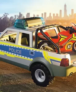 El ladrón se escapa a toda velocidad en su moto roja, pero la policía le pisa los talones con luces intermitentes y sirenas a todo volumen. El robusto Pick-Up Truck tiene espacio para cuatro figuras y puede transportar la moto con un caballete plegable en la parte trasera. Con equipo extraíble, una ingeniosa tira de clavos y otros accesorios, este producto PLAYMOBIL está repleto de diversión trepidante para emocionantes persecuciones. Una aventura perfecta para los pequeños y pequeñas luchadoras contra el crimen a los que les encanta la acción sobre ruedas.