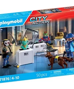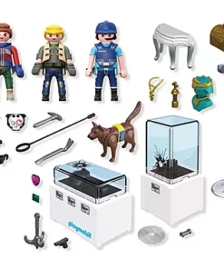 Contenido: Figuras: 1 policía, 2 ladrones (hombre y mujer); Animales: 1 perro guardián; Accesorios: 2 vitrinas de museo con joyas y corona, 2 focos, 1 mesa auxiliar, 1 cofre con joyas, 2 máscaras extraíbles, 1 cuerda con gancho, 1 hacha, 1 linterna, 1 palanca, 1 saco, 1 gorra de policía con micrófono, 1 pistola, 1 chaleco de seguridad para el perro, 1 correa para el perro