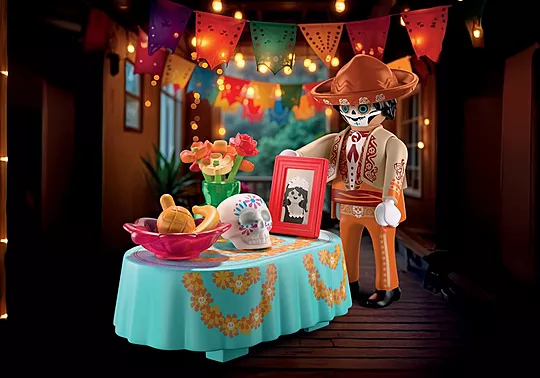 ¡Celebra la tradición con un toque de color y alegría! El Día de los Muertos de PLAYMOBIL da vida al espíritu festivo con detalles vibrantes y símbolos significativos. La mesa decorativa se puede decorar con frutas, flores, una calavera pintada y una foto enmarcada, perfecta para honrar a los seres queridos. Este hermoso producto PLAYMOBIL es ideal para el juego creativo que celebra la cultura, la memoria y la imaginación de una manera alegre.