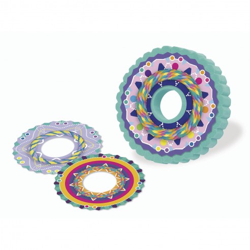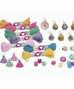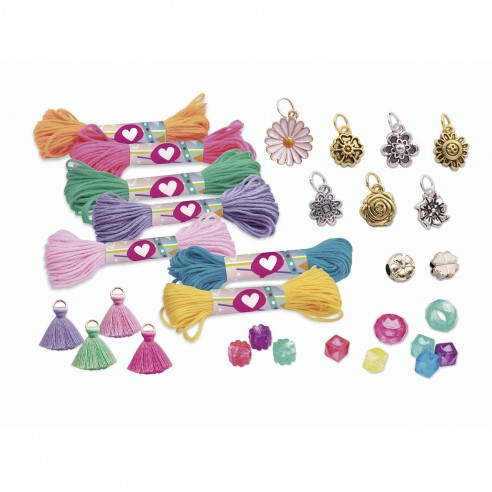 Set para fabricar pulseras de la amistad. Incluye hilos de algodón de diferentes colores, borlas, cuentas y sobre todo 7 colgantes metálicos espectaculares. Para ayudar en la fabricación, el set incluye una rueda de pulseras con tarjetas de patrones. Asi será mucho más facil diseñar y montar las pulseras.