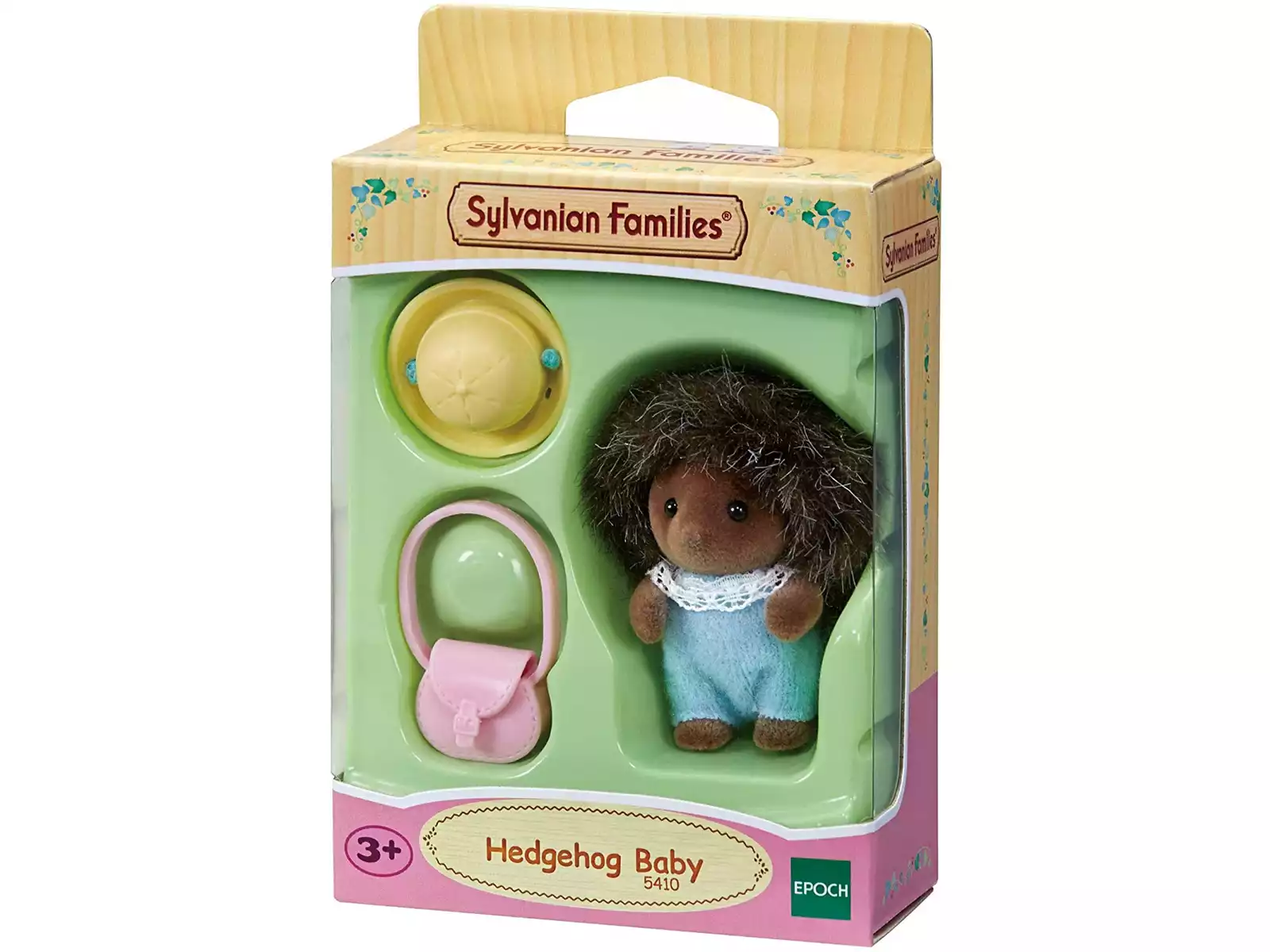 Incluye: 1 figura bebé erizo con conjunto azul, 1 gorrito amarillo con cuerda para la figura y 1 bolso rosa para la figura.