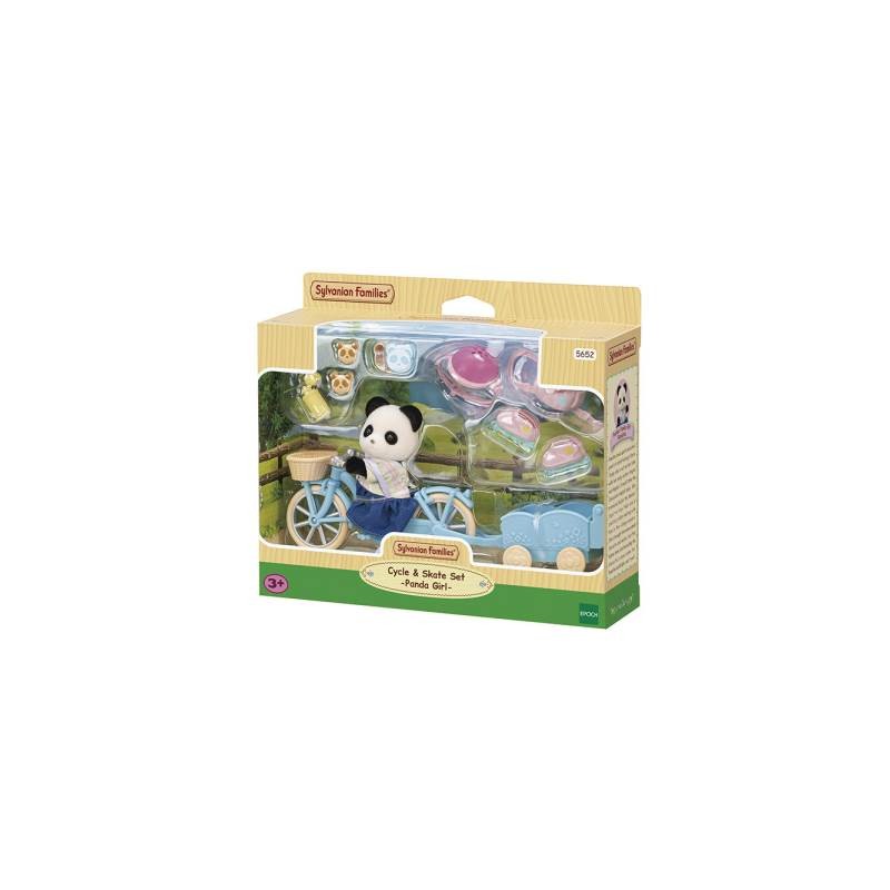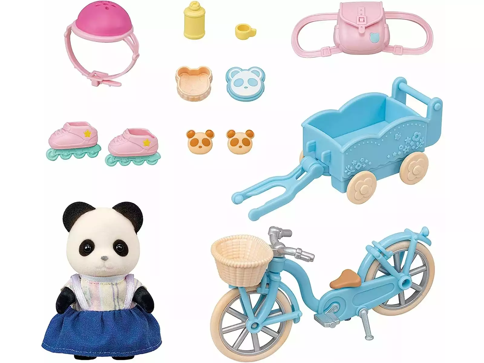 Incluye: 1 muñeca Rosalina Panda Pookie con vestido blanco y azul, 1 bicicleta de color azul con cesta delantera y remolque de color azul con barra de arrastre, 1 par de patines de color rosa, 1 mochila de color rosa, 1 casco de color fucsia, 1 botella amarilla, 1 sandwichera y 2 galletas.