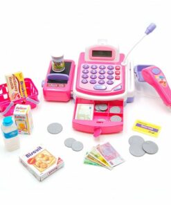 Caja registradora con luces y sonidos que parece de verdad! Incluye:1 caja registradora,1 cesta de la compra, varios artículos,monedas y billetes,1 llave y 1 escáner. Pilas incluidas.