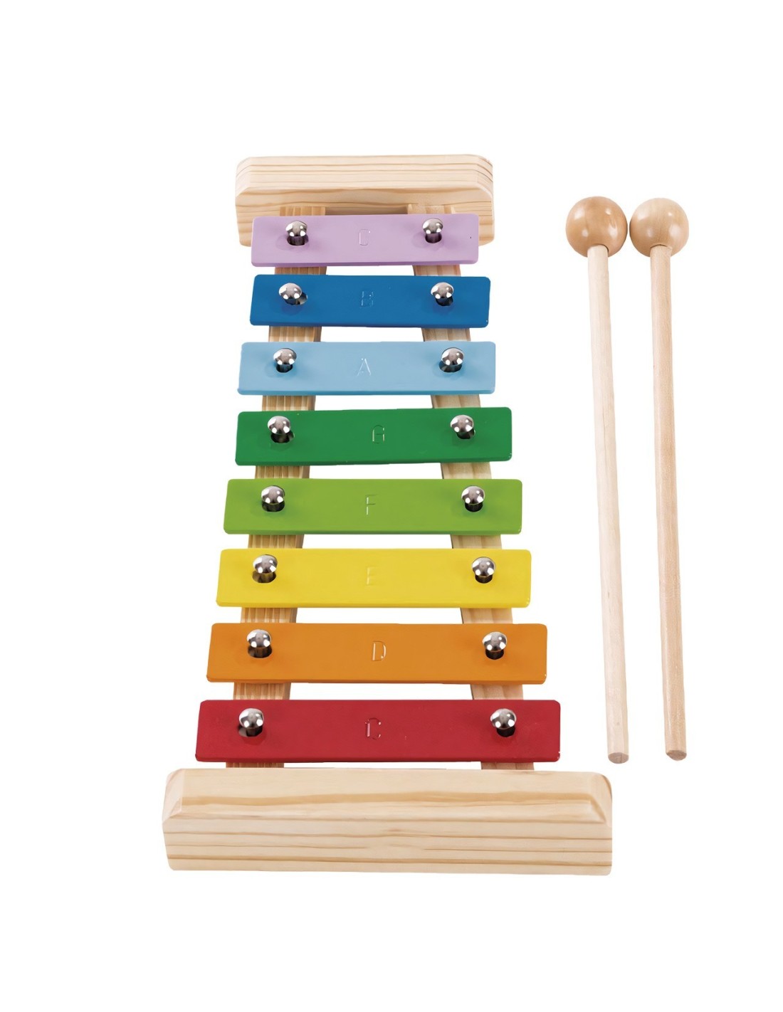 Xilófono de madera con baquetas. Los productos tienen la certificación FSC, lo que garantiza que la madera con la que estan fabricados proviene de bosques que preservan la biodiversidad y estan gestionados de forma beneficiosa y ambientalmente responsable.