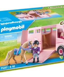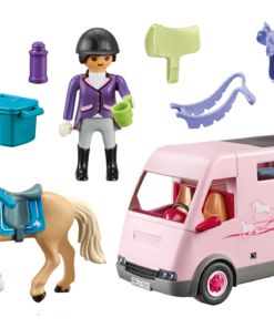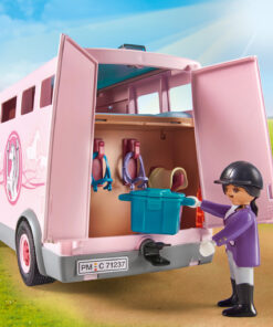 Ofrece espacio para el caballo que entra en el vehículo a través de la rampa plegable lateral. Los elementos del techo son desmontables, las puertas traseras del maletero se pueden abrir. Con dos camas para figuras y muchos accesorios. Dimensiones: 27 x 11 x 14 cm (largo x ancho x alto).